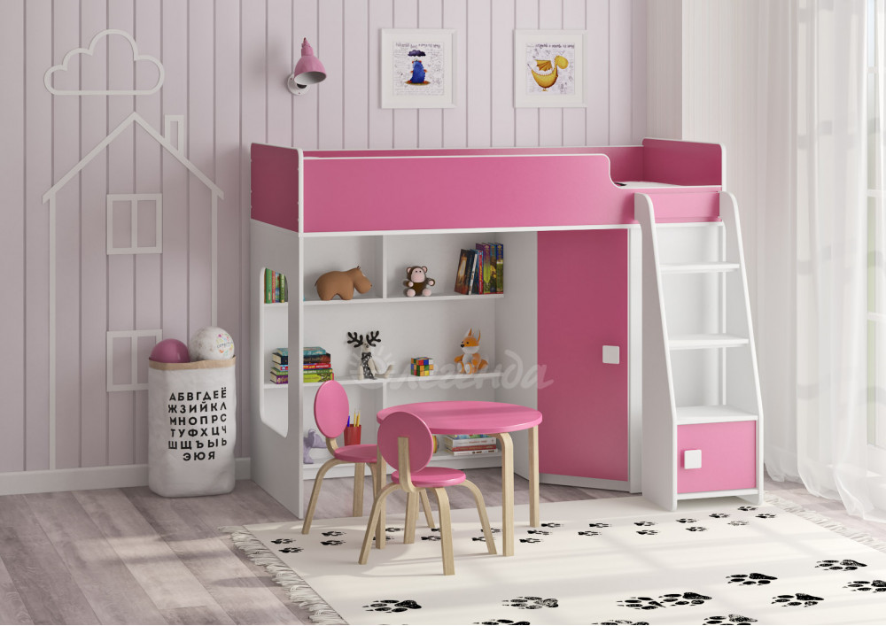 Внизу располагается игровая зона с полками – свой уголок для ребенка.
